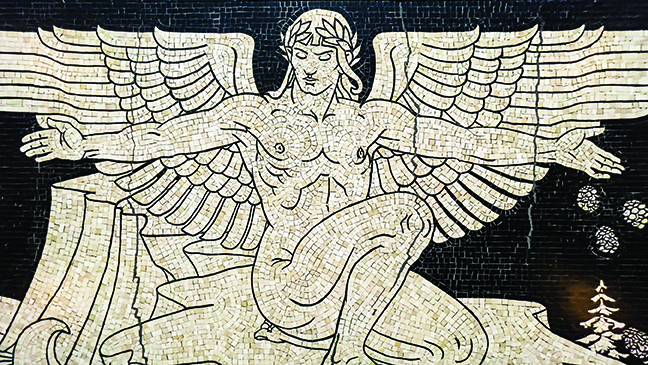 And you won’t be able to miss Hildreth Meiere’s magnificent mosaics underfoot in the Great Hall and Rotunda. One, called the Genius of Creative Energy, is the background of the new Nebraska license plates. The mosaics feature old classical nudes surrounded by new-world symbols of tens of thousands of marble tiles. Just the belly button of one takes eight tiles, according to a tour guide.