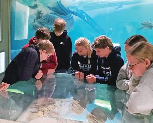 Junior high students join a UNSM educator to examine a mosasaur skull inside Morrill Hall’s Mesozoic Gallery. This specimen was discovered by Jon Morgenson and Steve Brey with Nebraska Game & Parks Commission on a roadcut inside Niobrara State Park and UNSM’s Highway Paleontology team recovered it.